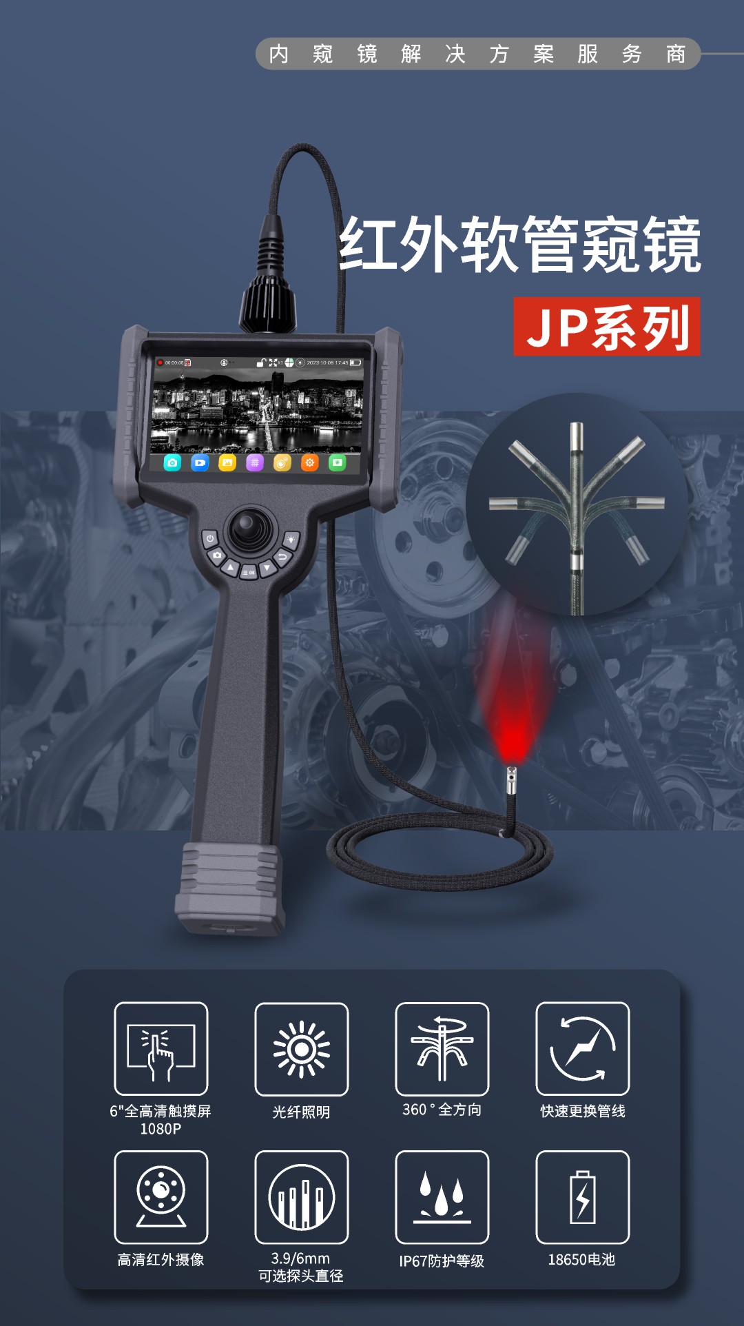 优势特点:红白双光源;6英寸大屏;双电路设计,单节电池也能工作;360°旋转探头
