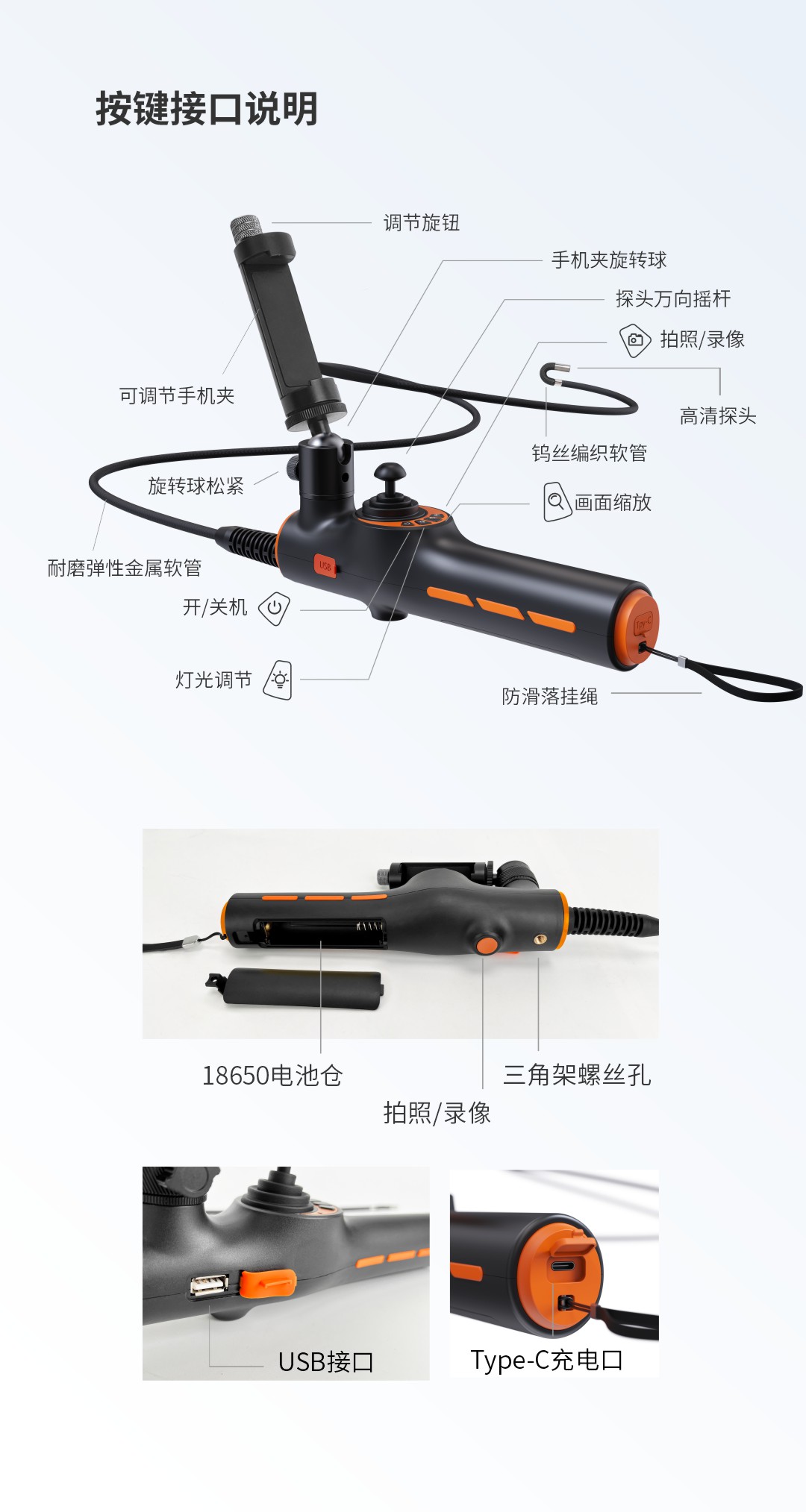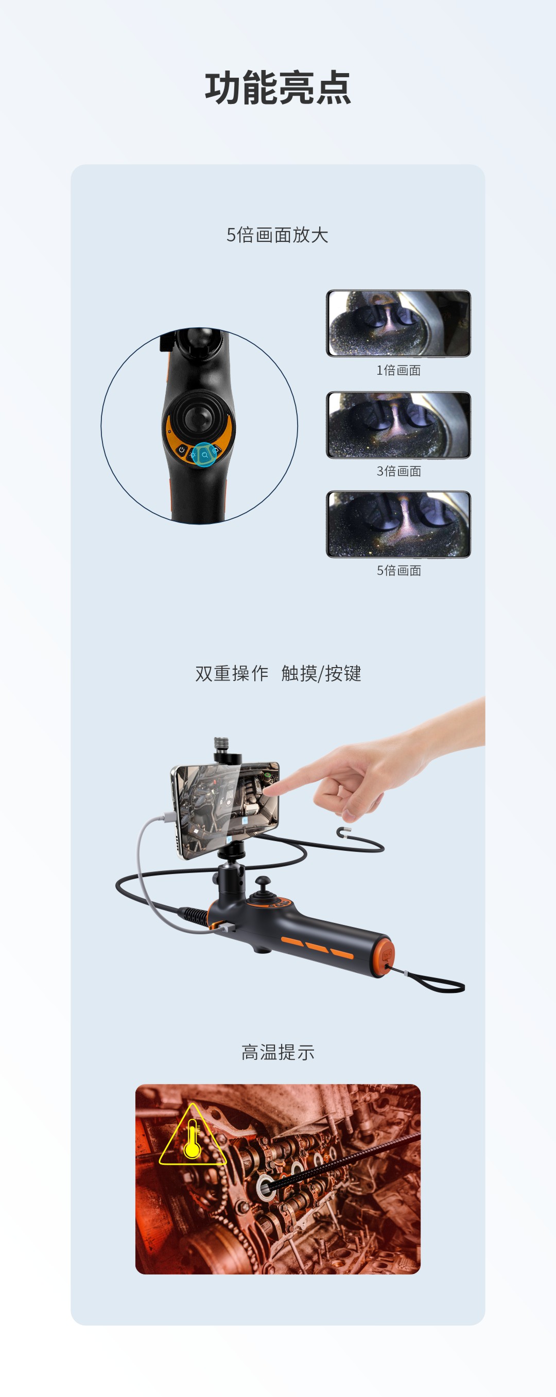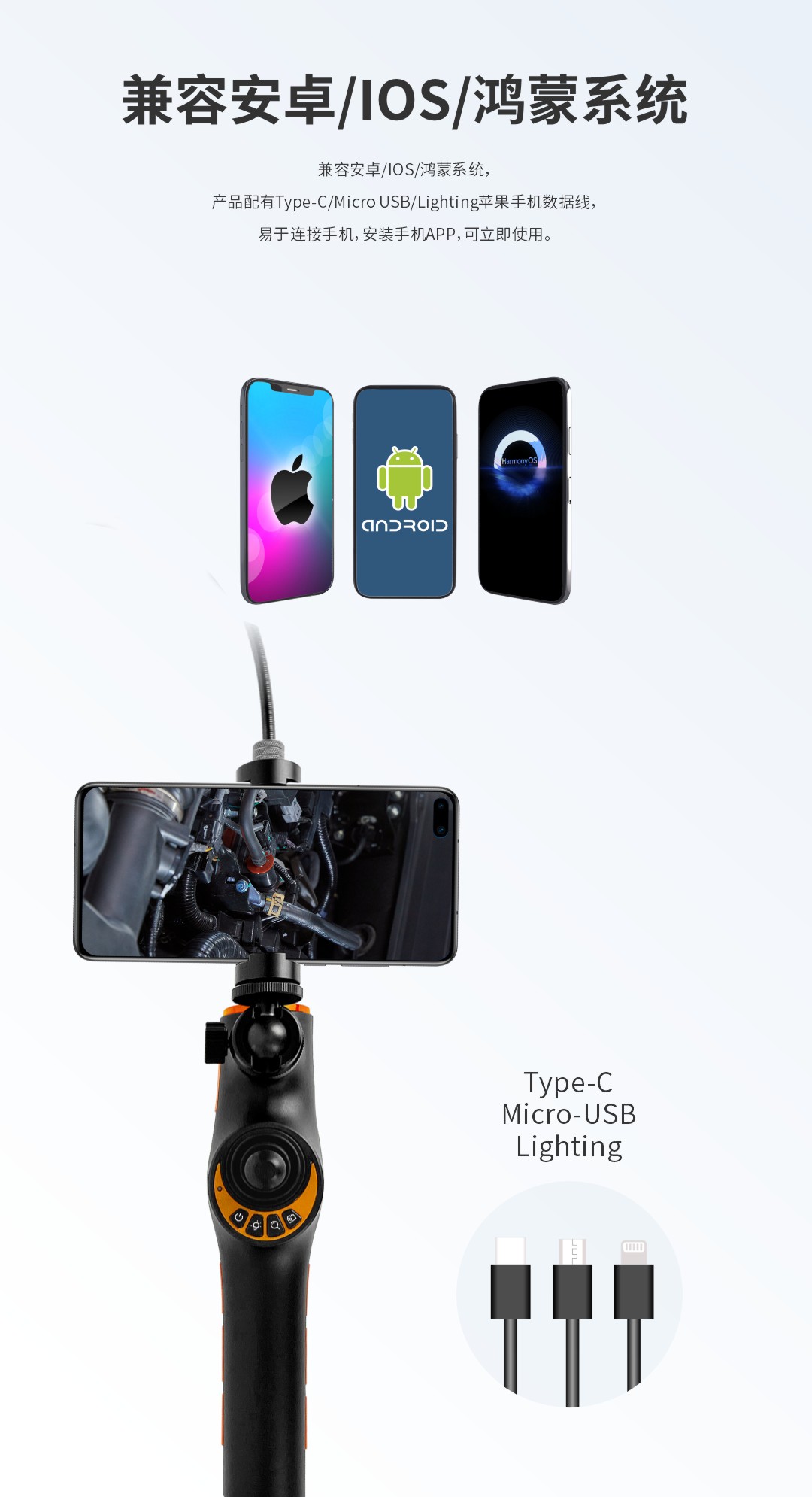 优势特点:兼容ISO、安卓、鸿蒙系统;探头360°全方位摆向;高温提示保护;即插即用;可生成检测报告