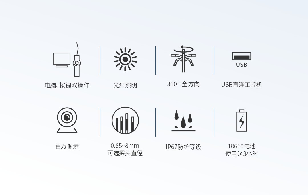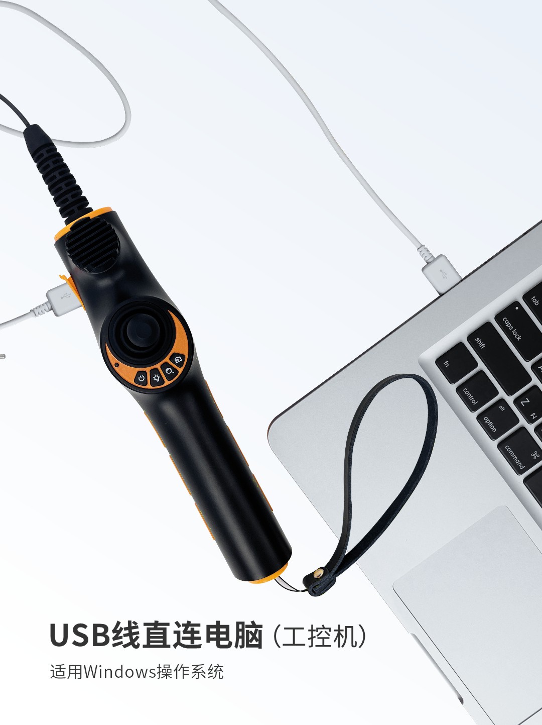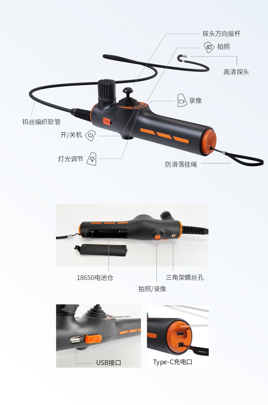 优势特点:USB接口直连电脑(工控机),0.95-8mm管径可选、360°全方位摆头、18650电池、配备Type-C充电口充电