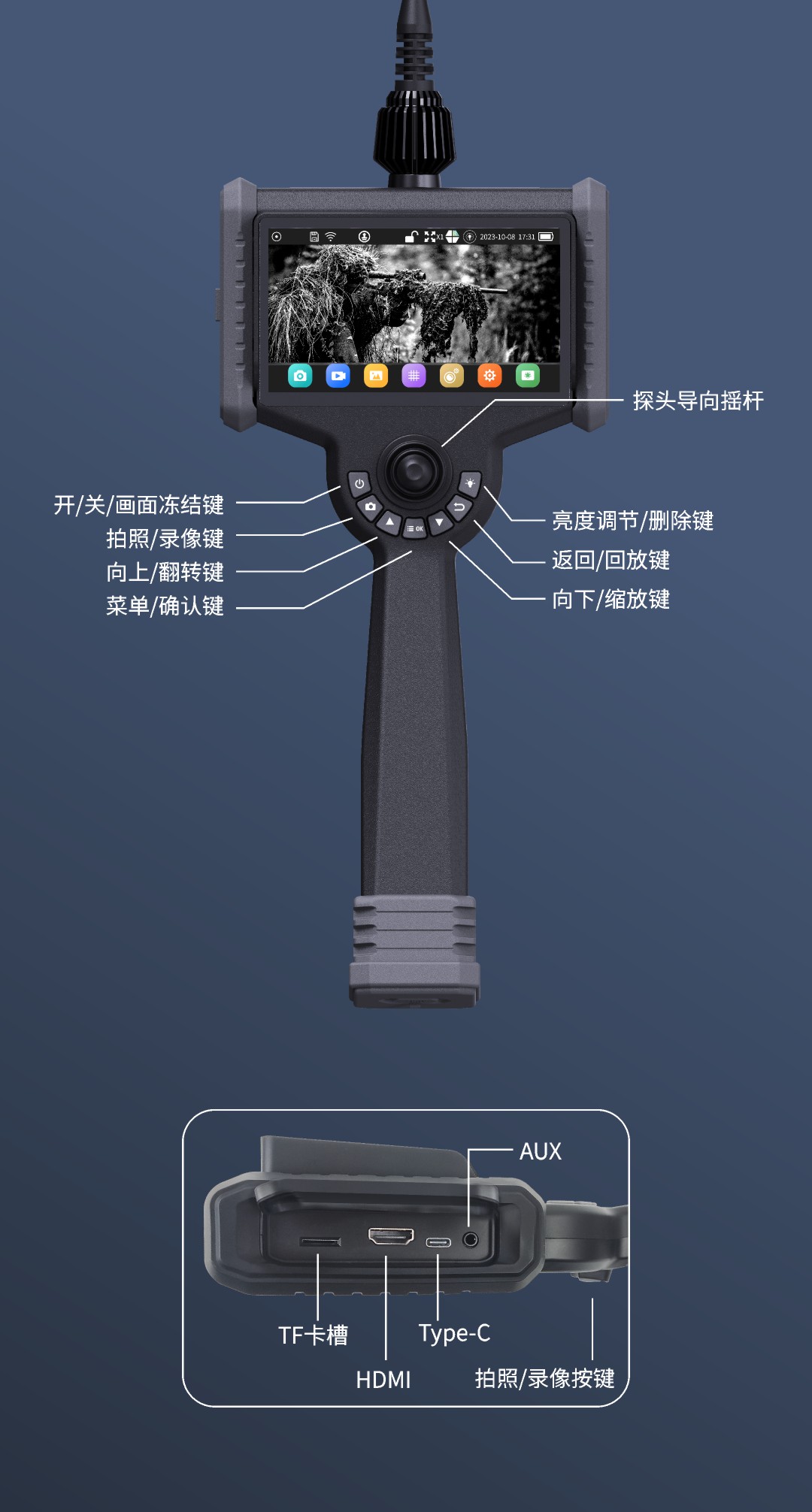 优势特点:红白双光源;6英寸大屏;双电路设计,单节电池也能工作;360°旋转探头